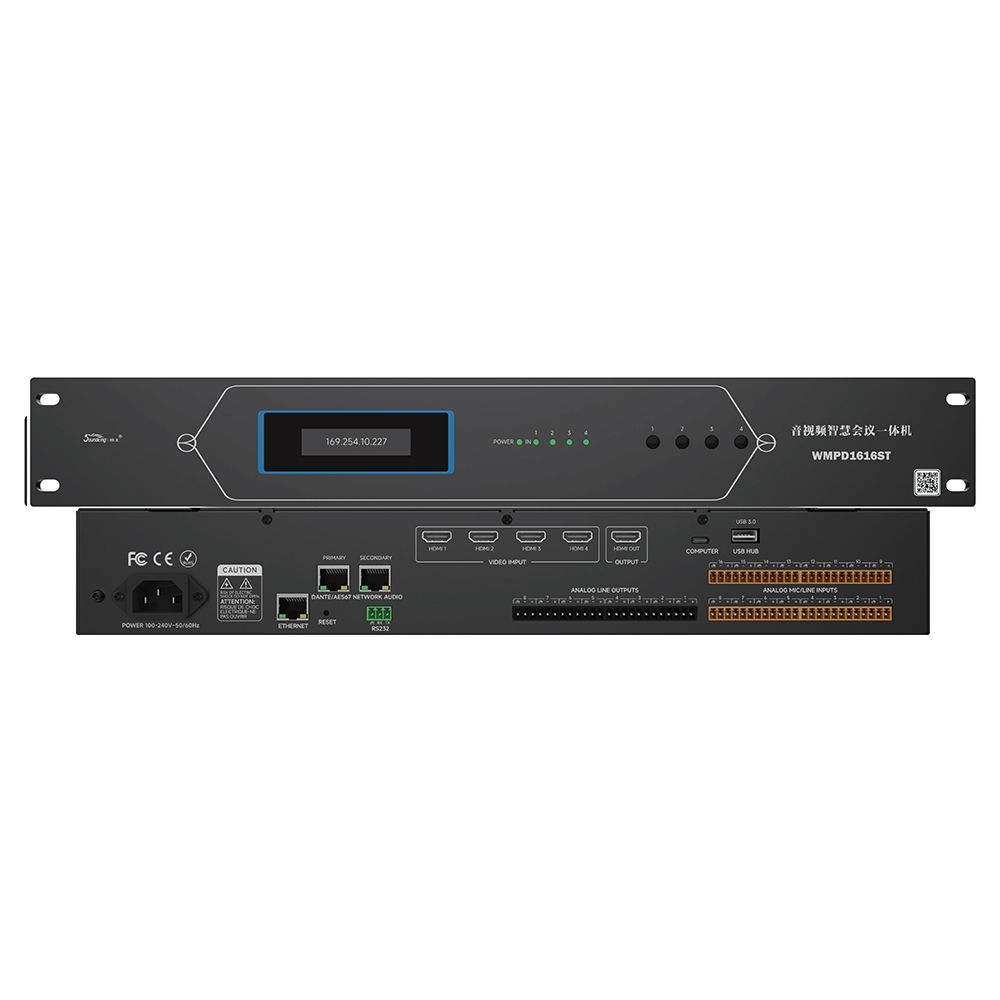 WMPD1616ST音視頻智慧會議一體機(jī)支持16路模擬輸入和8路模擬輸出,確保高品質(zhì)音頻傳輸和處理;還包括4x1HDMI+1路Type-C無縫視頻切換,提供清晰流暢的視頻畫面;同時支持Dante或AES67數(shù)字協(xié)議,可做高效和低延時的數(shù)字傳輸