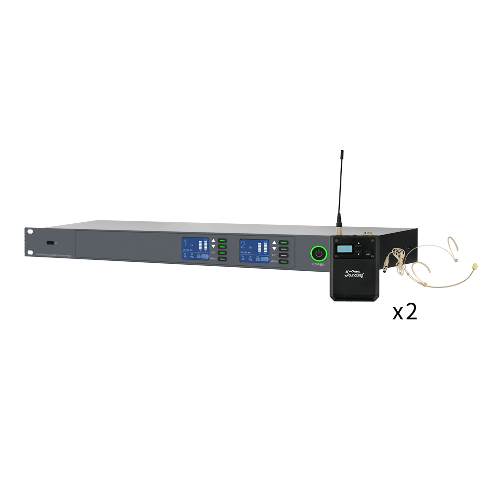 1. 一臺(tái)雙通道無(wú)線麥克風(fēng)收發(fā)主機(jī)和2臺(tái)腰包式發(fā)射器組成的麥克風(fēng)系統(tǒng);