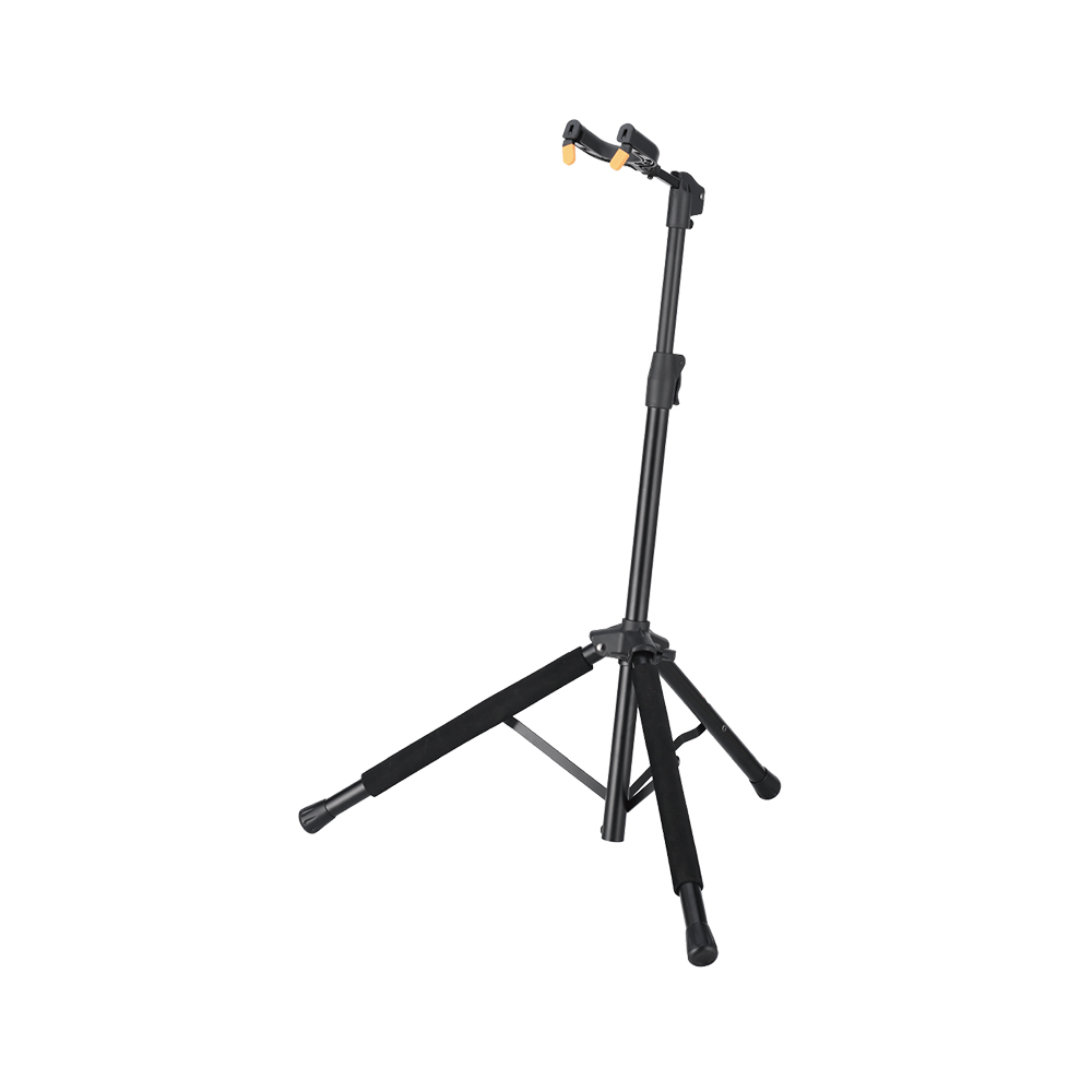 吉他架采用扳扣控制調(diào)節(jié)升降高度,吉他托頸通過(guò)吉他自重實(shí)現(xiàn)自鎖功能,吉他架腳管EVA管套保護(hù)吉他。