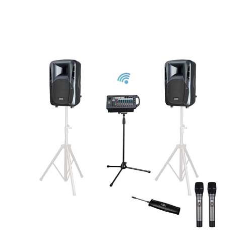 PAP10多功能便攜式組合音箱系統(tǒng),包括一對(duì)10”無(wú)源塑殼音箱+一臺(tái)10路信號(hào)輸入帶功放箱式調(diào)音臺(tái)+2只無(wú)線麥克風(fēng)。配上專用的音箱支架,就組成一套高性能的專業(yè)音箱系統(tǒng)。